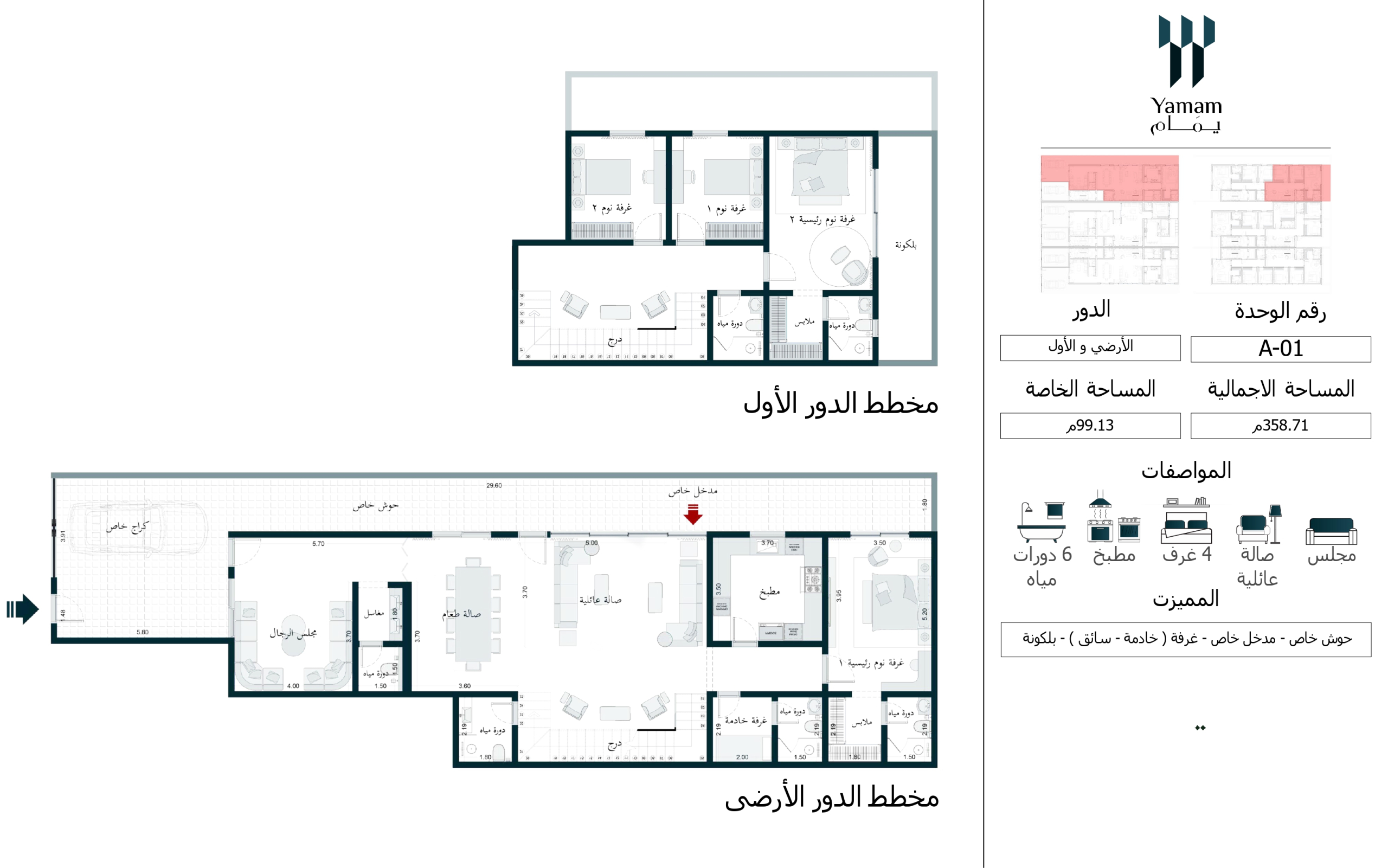 مجلس-مطبخ- غرفه خادمة - سطح - مصعد راكب - 5 غرف نوم - مدخل خاص - مدخل سياره - التكييف راكب - عدادات مستقله